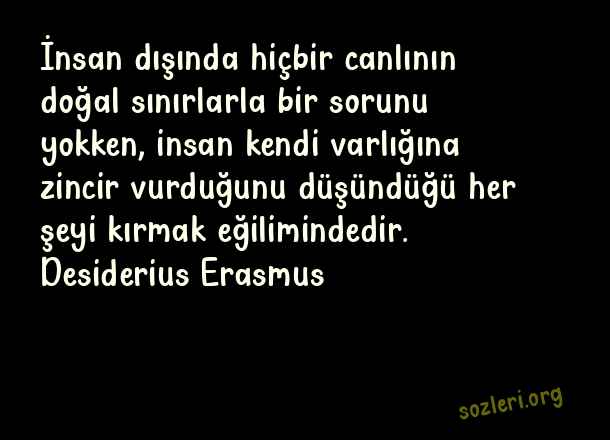 İnsan dışında hiçbir canlının doğal sınırlarla bir sorunu yokken, insan kendi varlığına zincir vurduğunu düşündüğü her şeyi kırmak eğilimindedir. Desiderius Erasmus ( Zincirleri Kırmak )