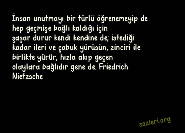 İnsan unutmayı bir türlü öğrenemeyip de hep geçmişe bağlı kaldığı için şaşar durur kendi kendine de; istediği kadar ileri ve çabuk yürüsün, zinciri ile birlikte yürür, hızla akıp geçen olaylara bağlıdır gene de. Friedrich Nietzsche ( Zincirleri Kırmak )