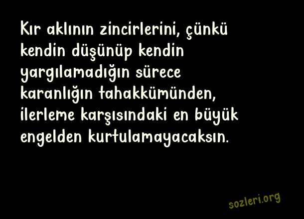Kır aklının zincirlerini, çünkü kendin düşünüp kendin yargılamadığın sürece karanlığın tahakkümünden, ilerleme karşısındaki en büyük engelden kurtulamayacaksın. ( Zincirleri Kırmak )