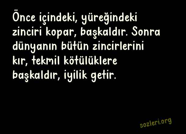 Önce içindeki, yüreğindeki zinciri kopar, başkaldır. Sonra dünyanın bütün zincirlerini kır, tekmil kötülüklere başkaldır, iyilik getir. ( Zincirleri Kırmak )