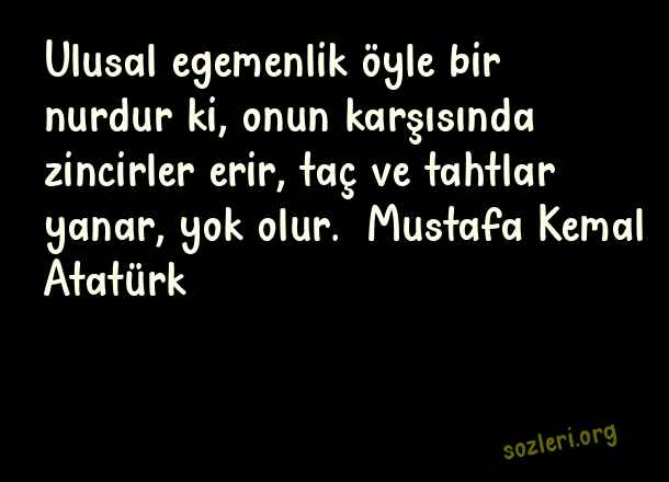 Ulusal egemenlik öyle bir nurdur ki, onun karşısında zincirler erir, taç ve tahtlar yanar, yok olur. Mustafa Kemal Atatürk ( Zincirleri Kırmak )